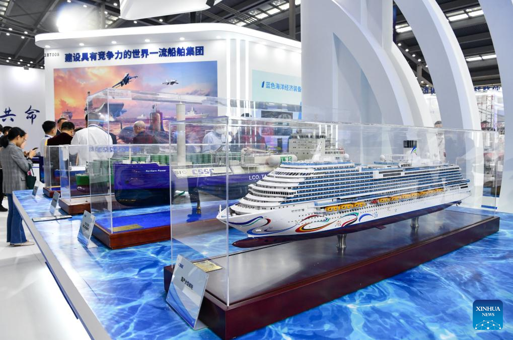This photo taken on Nov. 23, 2023 shows the booth of China State Shipbuilding Corporation Limited during the 2023 China Marine Economy Expo (CMEE) in Shenzhen, south China's Guangdong Province. The 2023 CMEE under the theme of "Open Cooperation and Win-win Sharing" kicked off in Shenzhen on Thursday. (Xinhua/Liang Xu)