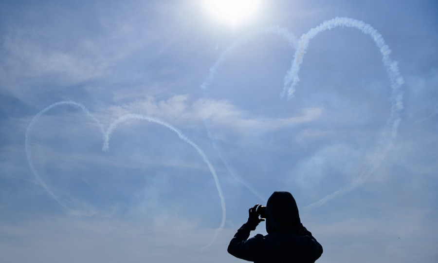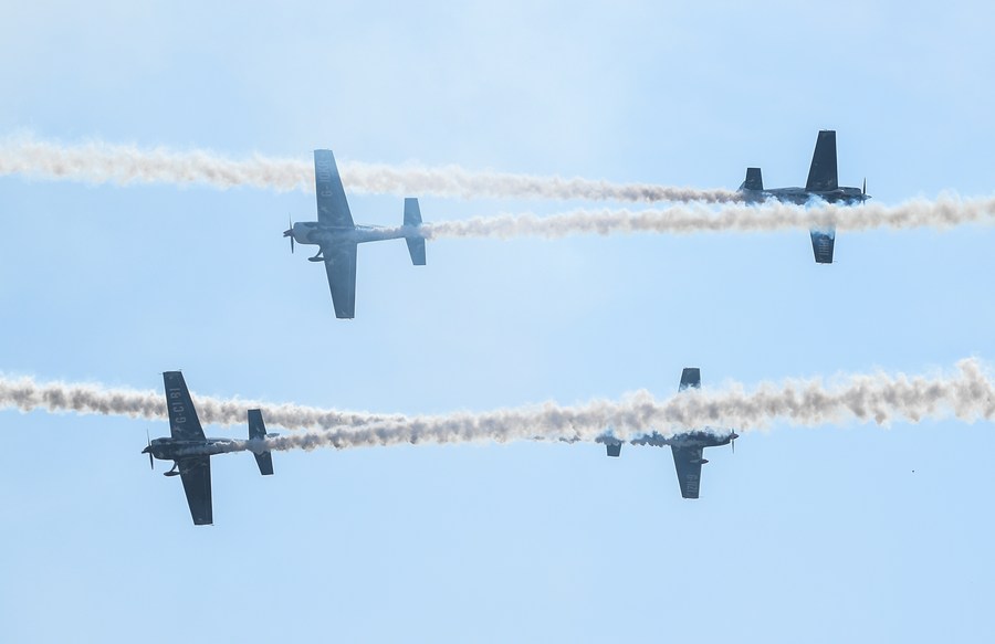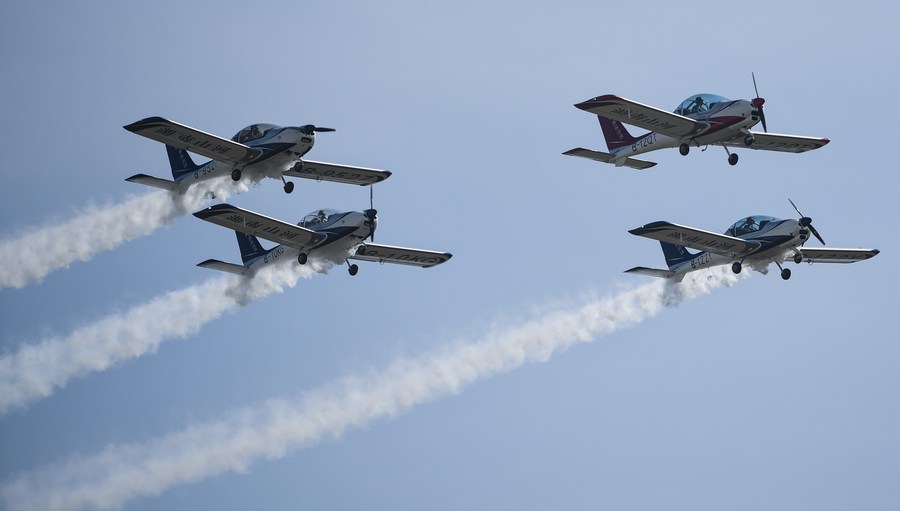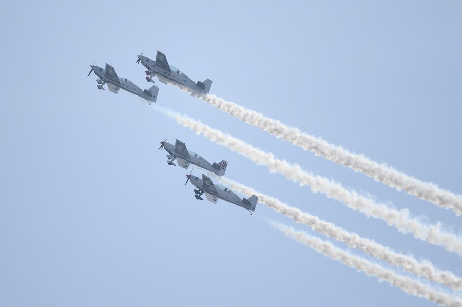 An aerobatic performance is staged during the 2023 Aero Asia show in Zhuhai, south China's Guangdong Province, Nov. 23, 2023. (Xinhua/Deng Hua)