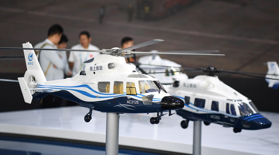 This photo taken on Nov. 23, 2023 shows models of maritime rescue helicopter exhibited at the booth of Aviation Industry Corporation of China during the 2023 Aero Asia show in Zhuhai, south China's Guangdong Province. (Xinhua/Deng Hua)