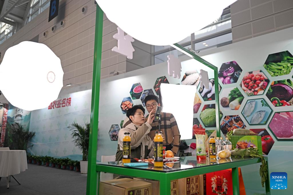 Exhibitors promote products via livestreaming at the 2023 China (Tianjin) International Fair for Investment and Trade & Pacific Economic Cooperation Council (PECC) Expo in north China's Tianjin, Nov. 23, 2023. (Xinhua/Zhao Zishuo)