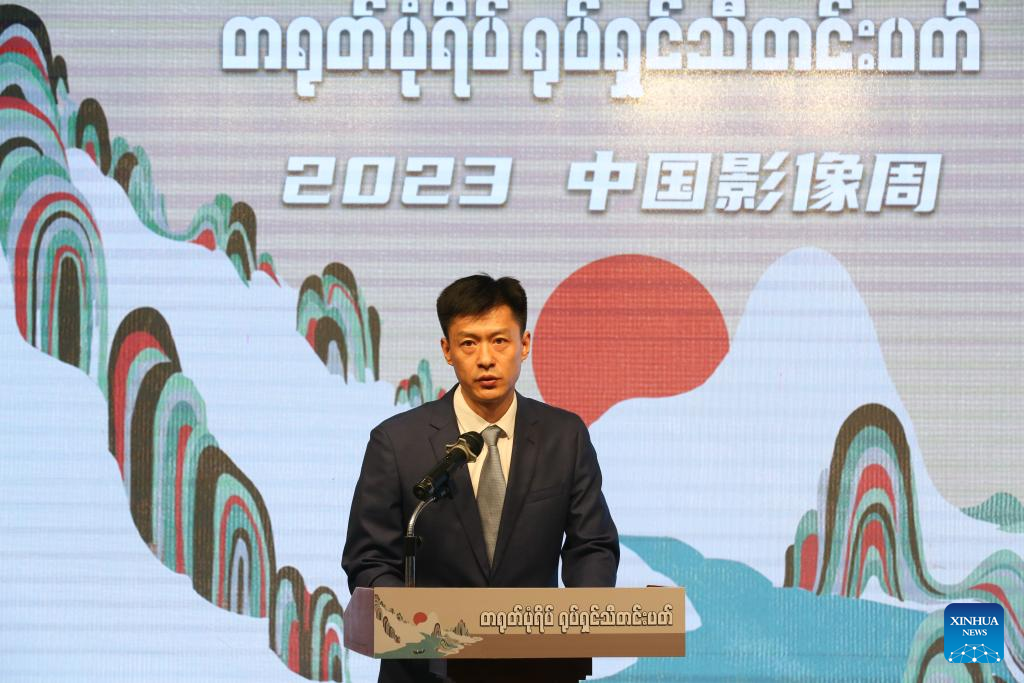 Zheng Zhihong, minister counsellor of the Chinese Embassy in Myanmar, delivers a speech at the opening ceremony of the 2023 Chinese Film Week at the China Cultural Center in Yangon, Myanmar, Nov. 23, 2023. The 2023 Chinese Film Week in Myanmar kicked off on Thursday with screening of five Chinese movies at the China Cultural Center in Yangon. (Photo by Myo Kyaw Soe/Xinhua)