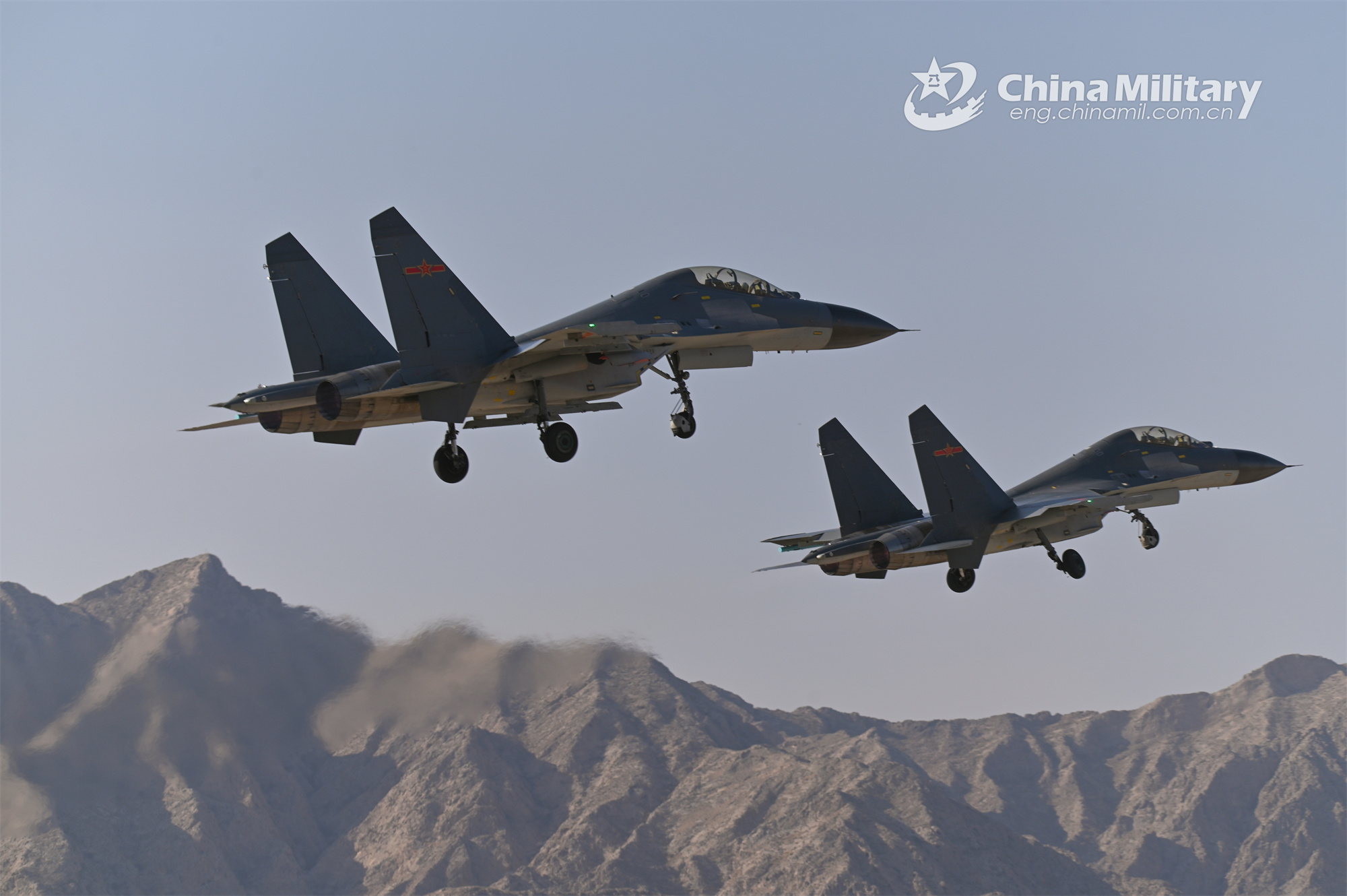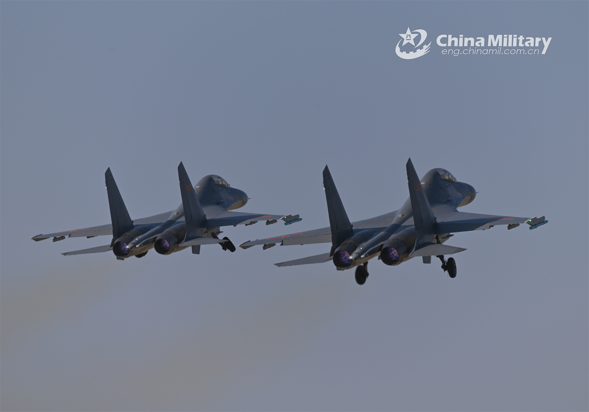 Fighter jets attached to an aviation brigade of the air force under the PLA Western Theater Command take off for a flight training exercise on November 16, 2023. (eng.chinamil.com.cn/Photo by Yu Zeqi)