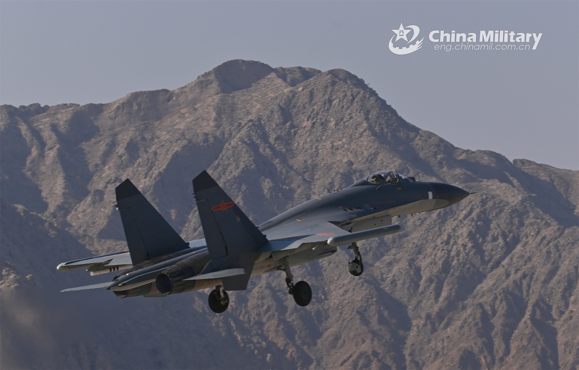 A fighter jet attached to an aviation brigade of the air force under the PLA Western Theater Command takes off for a flight training exercise on November 16, 2023. (eng.chinamil.com.cn/Photo by Yu Zeqi)