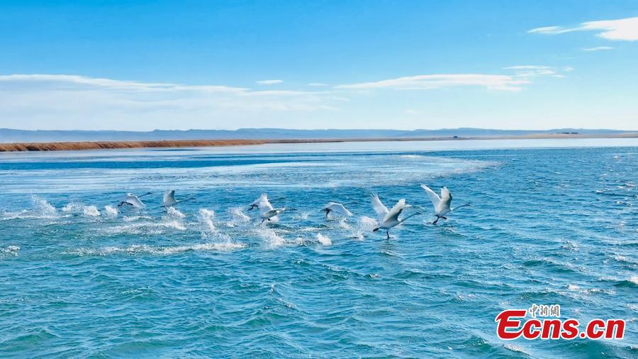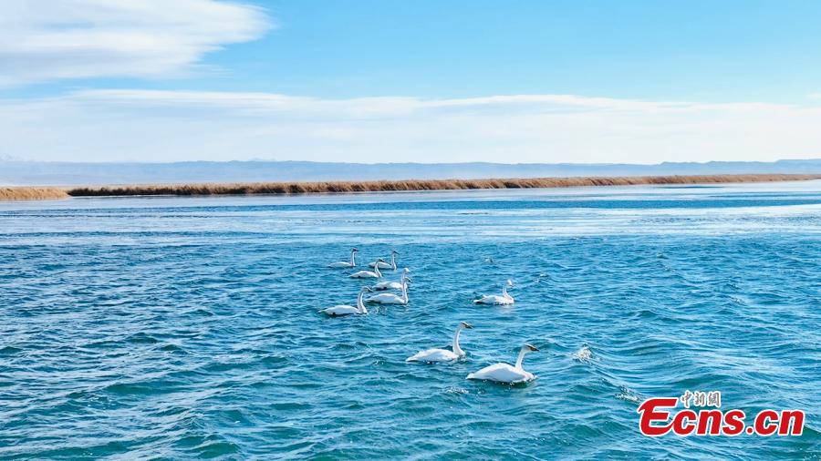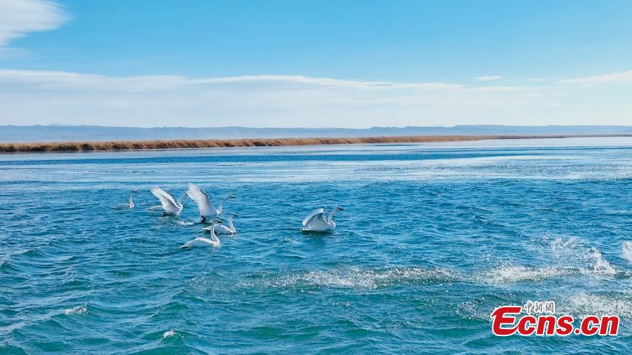 Whooper swans, under China's second-class state protection, swim in a lake surrounded by a desert, transforming it to a "Swan Lake" scene in Ulan county, Haixi Mongol and Tibetan Autonomous Prefecture, northwest China's Qinghai Province. (Photo provided to China News Service)
