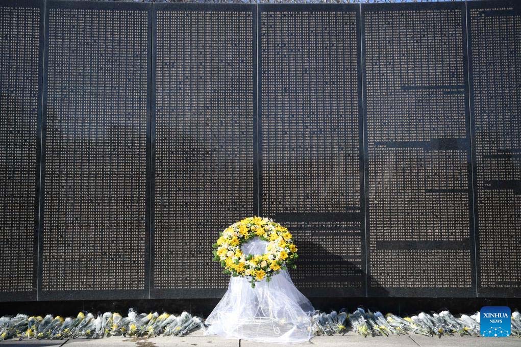 This photo taken on Nov. 24, 2023 shows the memorial wall of Chinese People's Volunteers (CPV) martyrs at the CPV martyrs' cemetery in Shenyang, northeast China's Liaoning Province. The remains of 25 CPV soldiers killed in the War to Resist U.S. Aggression and Aid Korea (1950-1953) were buried Friday in a cemetery in Shenyang.