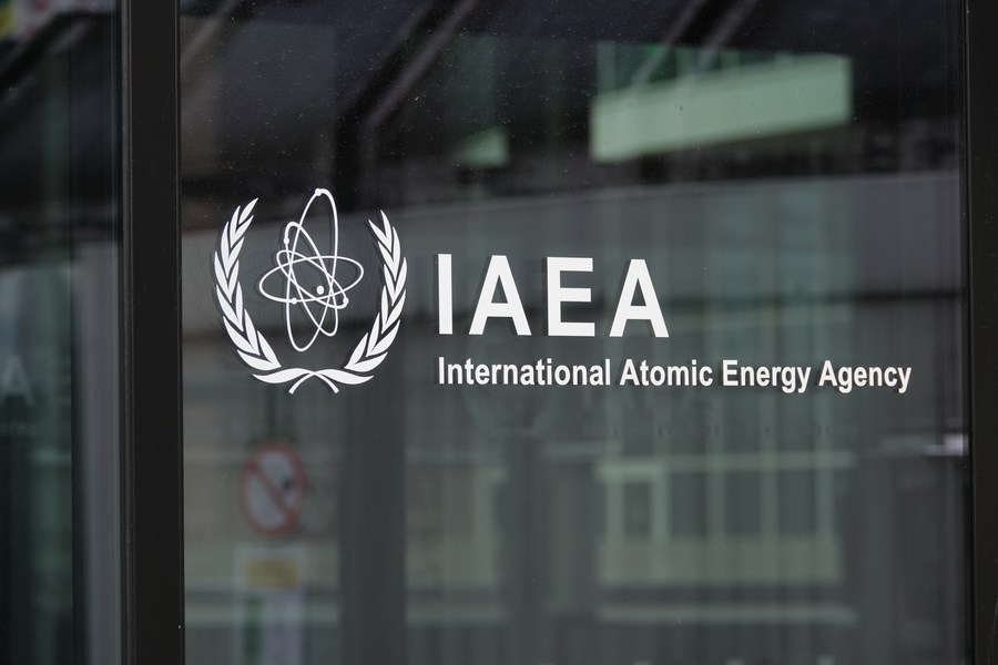 This photo taken on May 15, 2023 shows the logo of the International Atomic Energy Agency (IAEA) at the IAEA headquarters in Vienna, Austria. (Xinhua/Liu Xinyu)