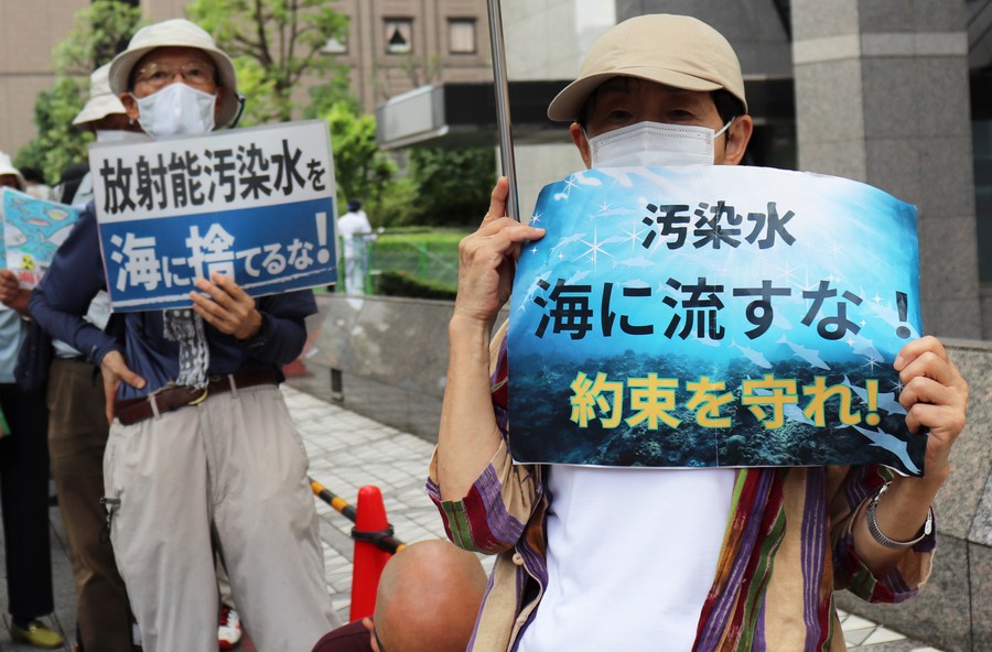 People gather to protest the Japanese government and Tokyo Electric Power Company's (TEPCO) decision on releasing nuclear-contaminated wastewater in front of the TEPCO headquarters in Tokyo, Japan, Aug. 24, 2023. (Xinhua/Yang Guang)