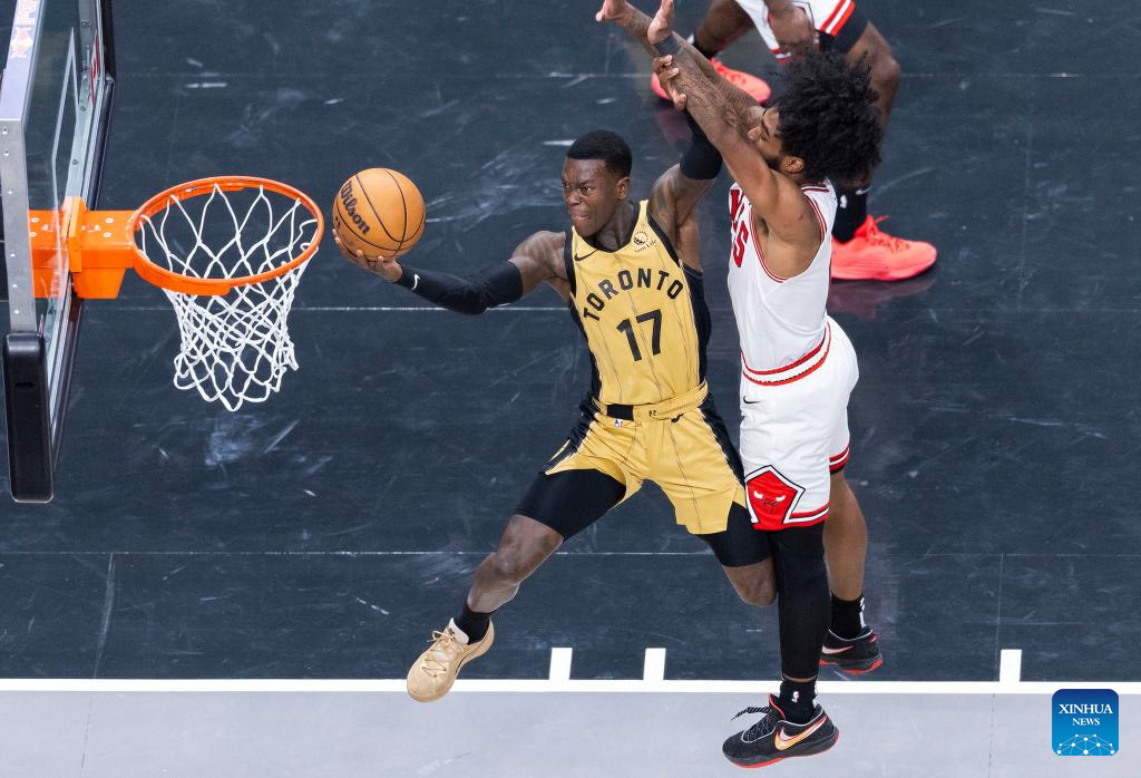 Dennis Schroder (L) of Toronto Raptors makes a layup during the 2023-2024 NBA In-Season Tournament game between Toronto Raptors and Chicago Bulls in Toronto, Canada, on Nov. 24, 2023. (Photo by Zou Zheng/Xinhua)