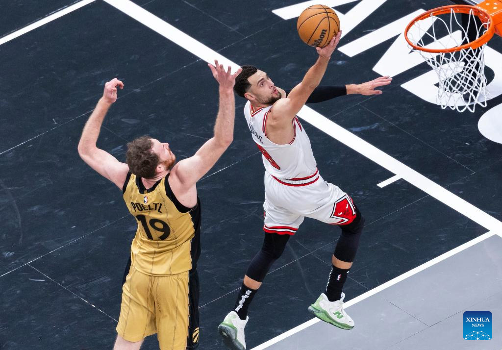 Zach LaVine (R) of Chicago Bulls makes a layup during the 2023-2024 NBA In-Season Tournament game between Toronto Raptors and Chicago Bulls in Toronto, Canada, on Nov. 24, 2023. (Photo by Zou Zheng/Xinhua)