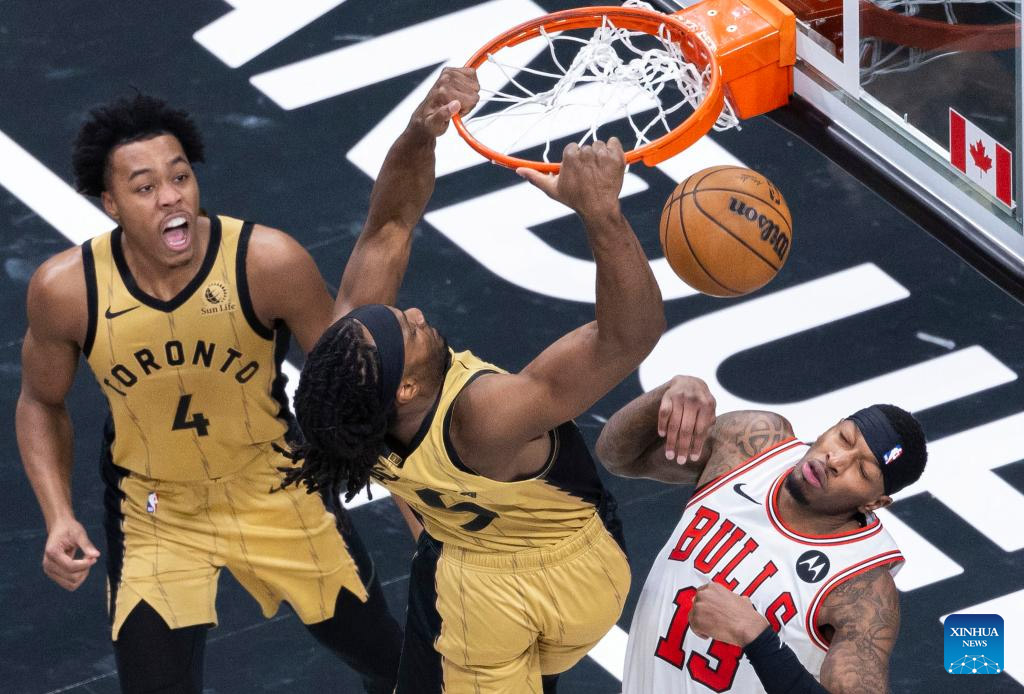 Precious Achiuwa (C) of Toronto Raptors dunks during the 2023-2024 NBA In-Season Tournament game between Toronto Raptors and Chicago Bulls in Toronto, Canada, on Nov. 24, 2023. (Photo by Zou Zheng/Xinhua)