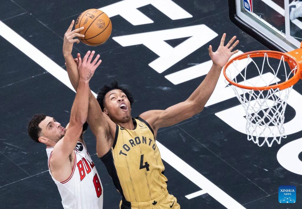 Zach LaVine (L) of Chicago Bulls fights for a rebound with Scottie Barnes of Toronto Raptors during the 2023-2024 NBA In-Season Tournament game between Toronto Raptors and Chicago Bulls in Toronto, Canada, on Nov. 24, 2023. (Photo by Zou Zheng/Xinhua)