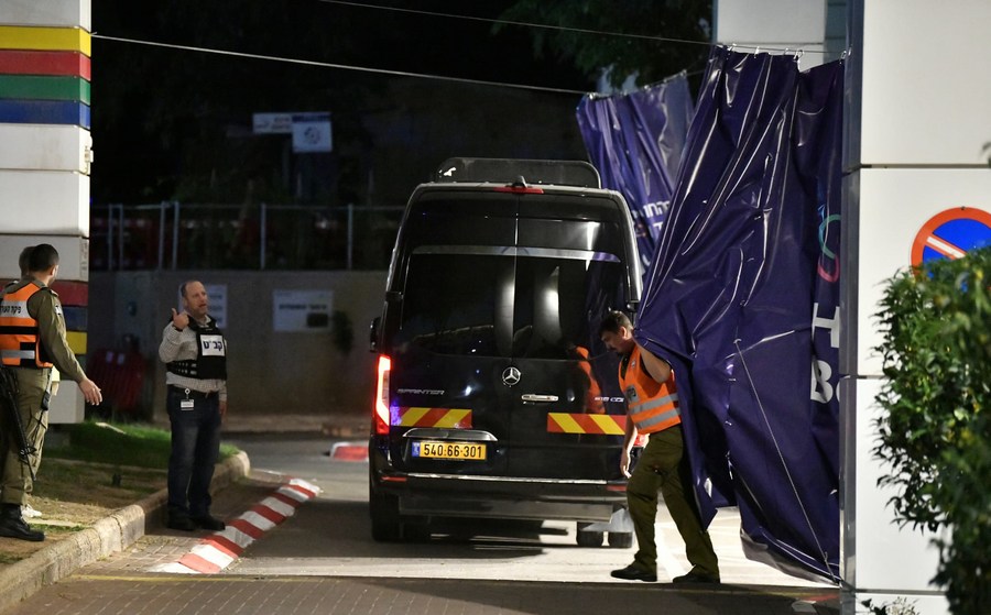 A vehicle carrying hostages released from the Gaza Strip arrives at a hospital in Ramat Gan, Israel, Nov. 26, 2023. (JINI via Xinhua)