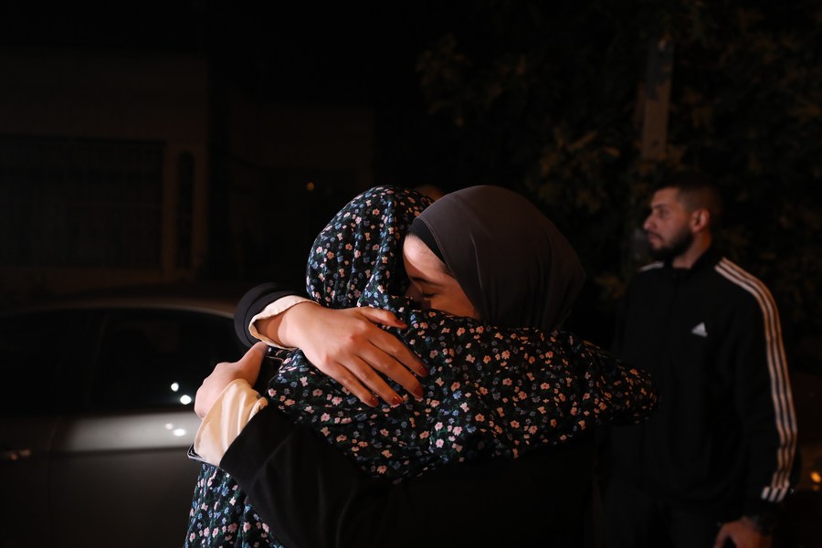 A Palestinian prisoner (L) returns to Jerusalem after being released from the Israeli Ofer prison, on Nov. 24, 2023. (Photo by Muammar Awad/Xinhua)