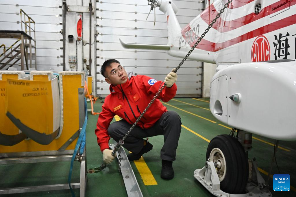 Wang Fa, a machinist, checks and tightens constraining gears aboard China's research icebreaker Xuelong 2, on Nov. 26, 2023. Currently on an Antarctic expedition, the icebreaker, otherwise known as Snow Dragon 2, is ploughing through the belt of prevailing westerlies, nicknamed the "rolling forties," with its companion cargo vessel Tian Hui. (Xinhua/Zhou Yuan)