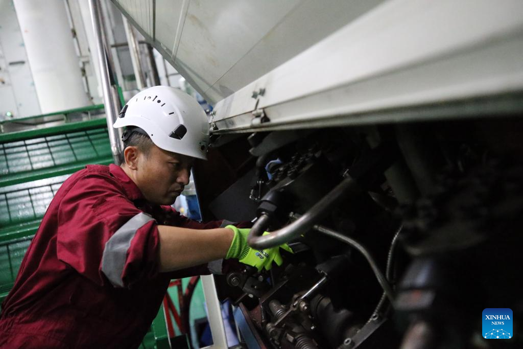 Chief Machinist Tang Jianguo checks equipment aboard China's research icebreaker Xuelong 2, on Nov. 26, 2023. Currently on an Antarctic expedition, the icebreaker, otherwise known as Snow Dragon 2, is ploughing through the belt of prevailing westerlies, nicknamed the "rolling forties," with its companion cargo vessel Tian Hui. (Xinhua/Zhou Yuan)