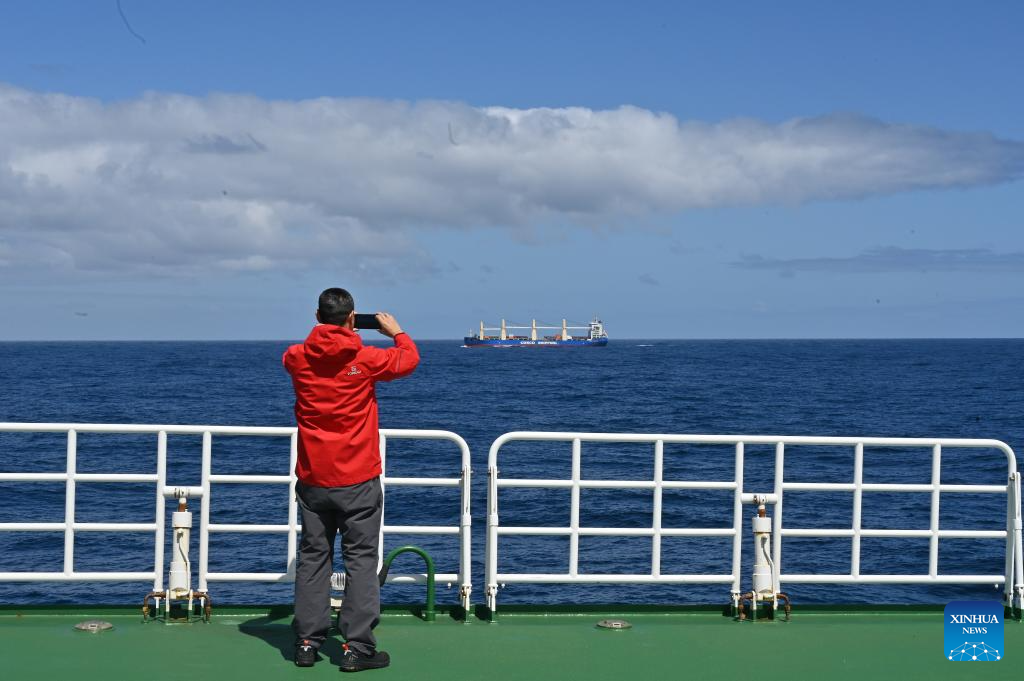 China's research icebreaker Xuelong 2 and cargo vessel Tian Hui sail in the belt of prevailing westerlies on Nov. 25, 2023. Currently on an Antarctic expedition, the icebreaker, otherwise known as Snow Dragon 2, is ploughing through the belt of prevailing westerlies, nicknamed the "rolling forties," with its companion cargo vessel Tian Hui. (Xinhua/Zhou Yuan)