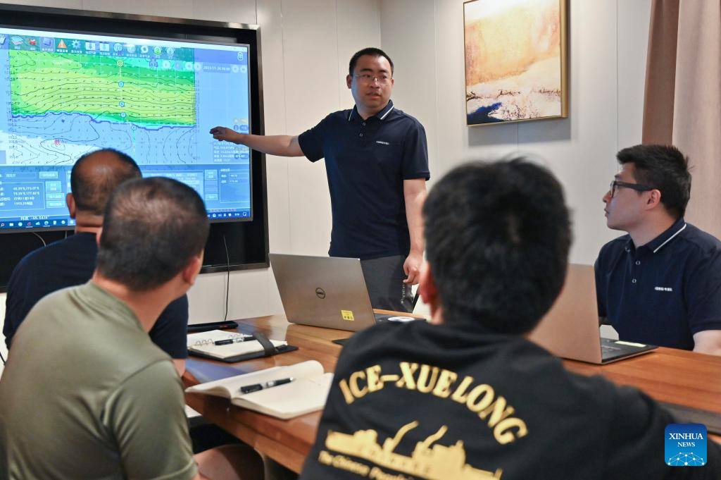 Li Jingshi, a meteorological expert, illustrates weather conditions under westerlies aboard China's research icebreaker Xuelong 2, on Nov. 23, 2023. Currently on an Antarctic expedition, the icebreaker, otherwise known as Snow Dragon 2, is ploughing through the belt of prevailing westerlies, nicknamed the "rolling forties," with its companion cargo vessel Tian Hui. (Xinhua/Zhou Yuan)