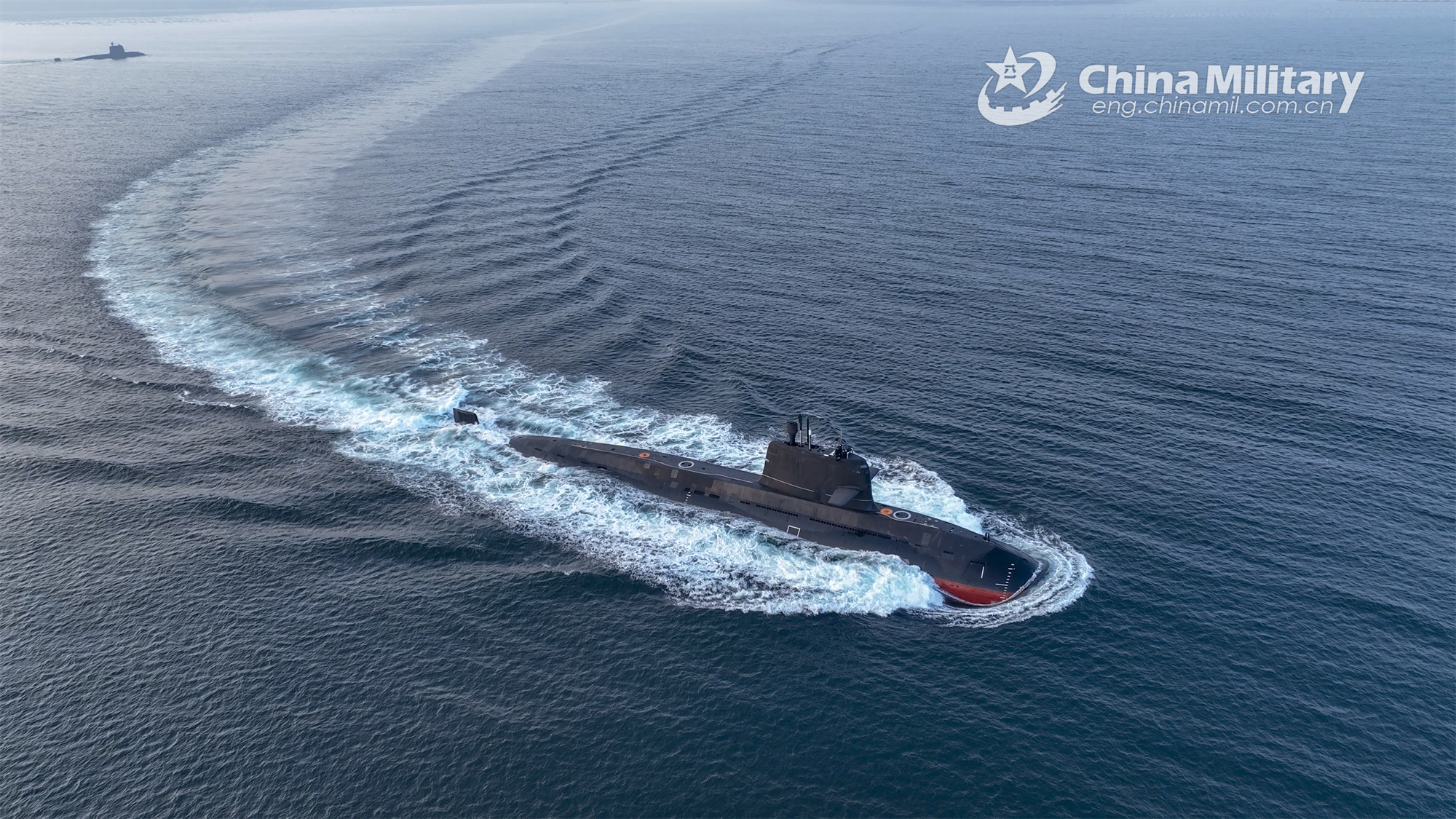 A submarine attached to a submarine flotilla with the navy under the PLA Northern Theater Command steams to the designated sea area for training exercise in mid-November, 2023. (eng.chinamil.com.cn/Photo by Zhang Nan)