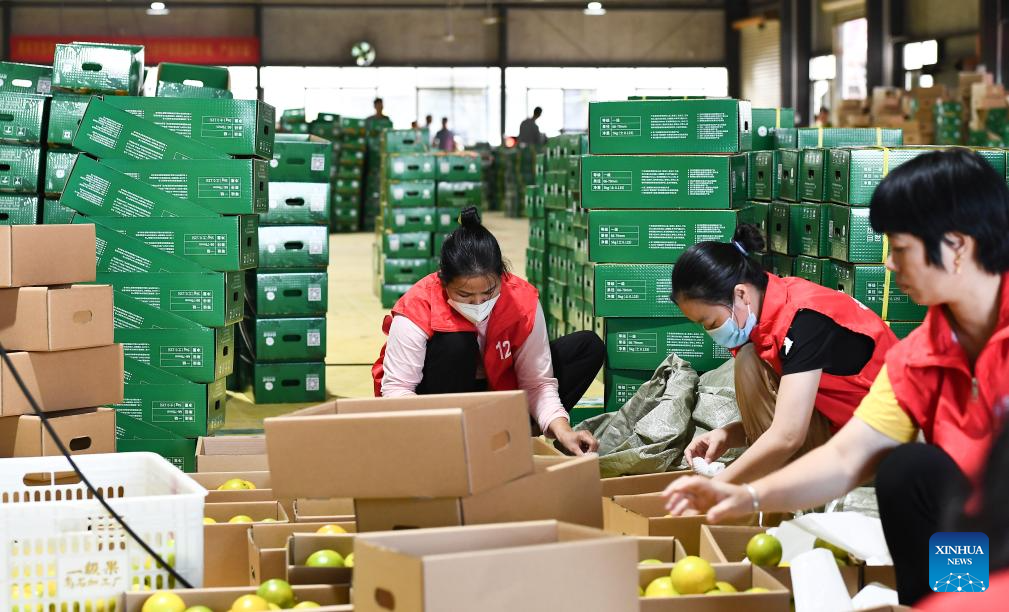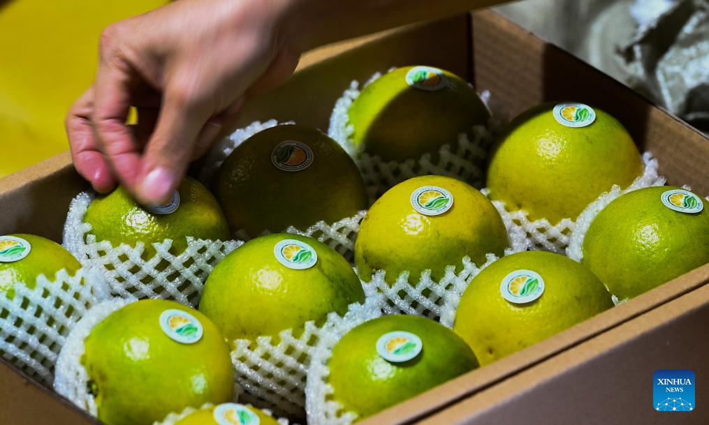 Staff members pack green oranges at a processing factory in Qiongzhong Li and Miao Autonomous County, south China's Hainan Province, Nov. 23, 2023. There are more than 330 green orange orchards in Qiongzhong, covering an area of about 32,000 mu (about 2133.3 hectares). The output of the green orange in the county this year is expected to reach 12,500 tonnes, with an output value exceeding 200 million yuan (about 27.97 million dollars). (Xinhua/Yang Guanyu)