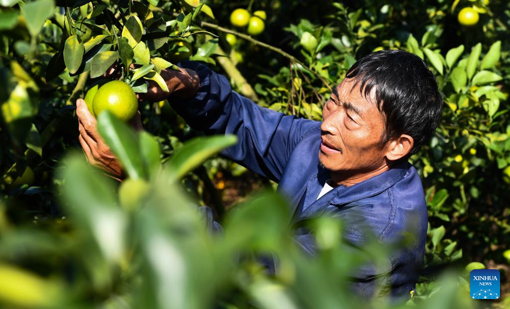 A staff member picks green oranges at a planting base in Qiongzhong Li and Miao Autonomous County, south China's Hainan Province, Nov. 24, 2023. There are more than 330 green orange orchards in Qiongzhong, covering an area of about 32,000 mu (about 2133.3 hectares). The output of the green orange in the county this year is expected to reach 12,500 tonnes, with an output value exceeding 200 million yuan (about 27.97 million dollars). (Xinhua/Yang Guanyu)