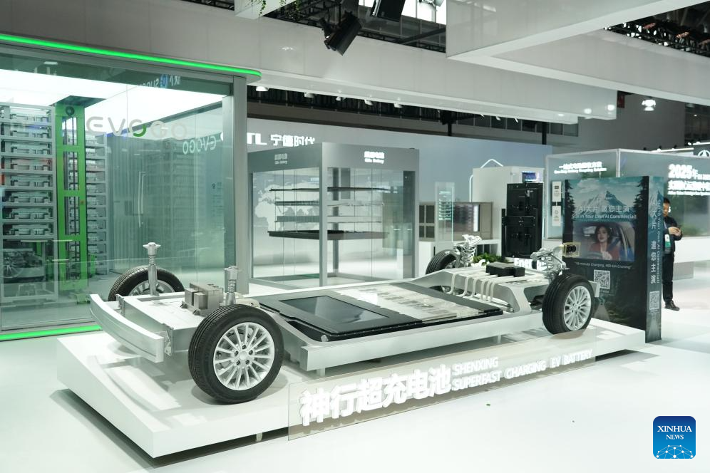 This photo taken on Nov. 26, 2023 shows a superfast charging EV battery platform from China's battery giant Contemporary Amperex Technology Co., Ltd. at the China International Supply Chain Expo (CISCE) in Beijing, capital of China. The first CISCE will be held from Nov. 28 to Dec. 2 in Beijing. (Xinhua/Ren Chao)