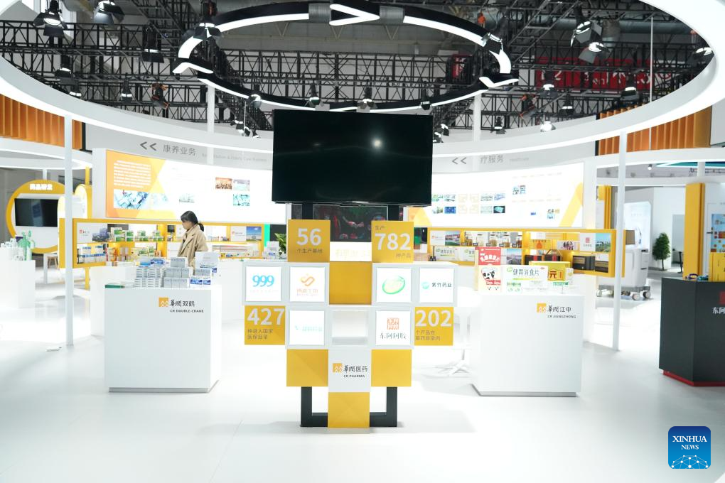 This photo taken on Nov. 26, 2023 shows the booth of the China Resources Pharmaceutical Commercial Group Co., Ltd. at the China International Supply Chain Expo (CISCE) in Beijing, capital of China. The first CISCE will be held from Nov. 28 to Dec. 2 in Beijing. (Xinhua/Ren Chao)