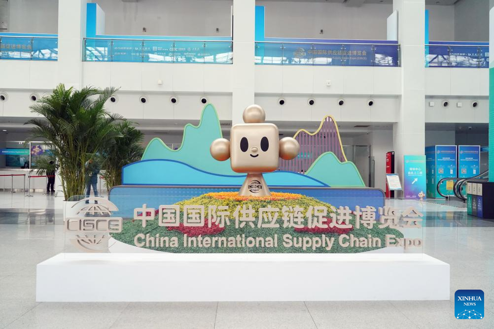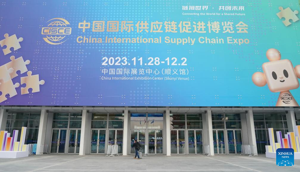 This photo taken on Nov. 26, 2023 shows the venue of the China International Supply Chain Expo (CISCE) in Beijing, capital of China. The first CISCE will be held from Nov. 28 to Dec. 2 in Beijing. (Xinhua/Ren Chao)
