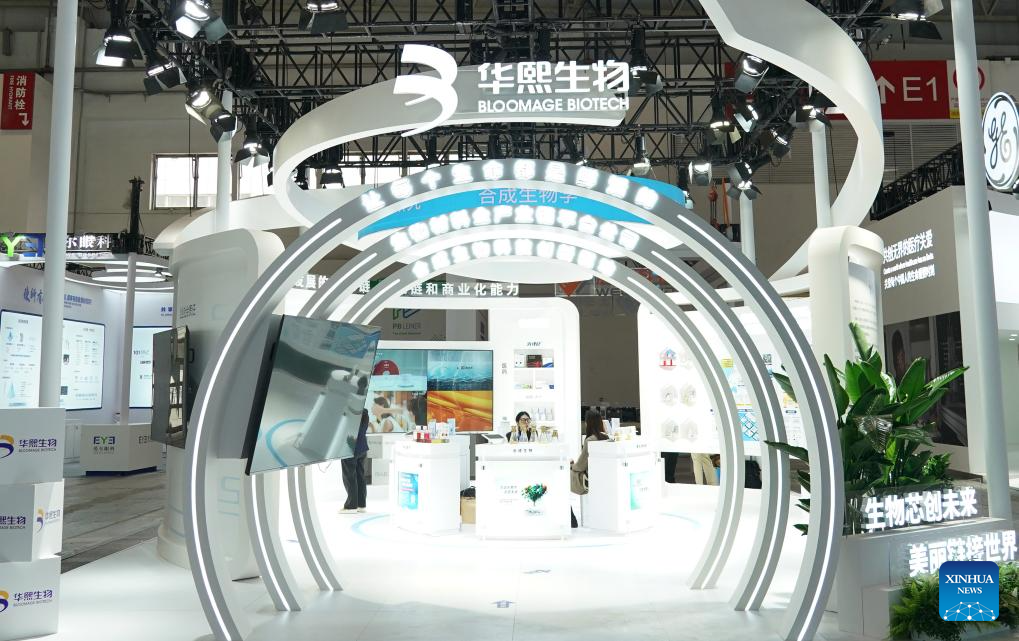 This photo taken on Nov. 26, 2023 shows the booth of Bloomage Biotech at the China International Supply Chain Expo (CISCE) in Beijing, capital of China. The first CISCE will be held from Nov. 28 to Dec. 2 in Beijing. (Xinhua/Ren Chao)