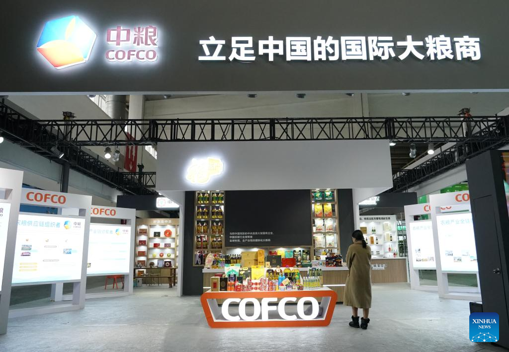 This photo taken on Nov. 26, 2023 shows the booth of China's leading agricultural and food company COFCO at the China International Supply Chain Expo (CISCE) in Beijing, capital of China. The first CISCE will be held from Nov. 28 to Dec. 2 in Beijing. (Xinhua/Ren Chao)