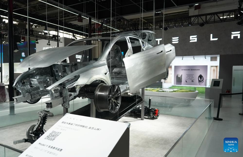 This photo taken on Nov. 26, 2023 shows the Tesla booth at the China International Supply Chain Expo (CISCE) in Beijing, capital of China. The first CISCE will be held from Nov. 28 to Dec. 2 in Beijing. (Xinhua/Ren Chao)