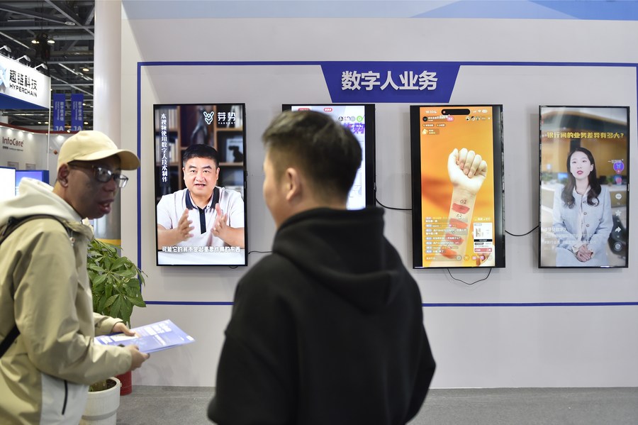 People visit a booth of digital human figures at the second Global Digital Trade Expo in Hangzhou, east China's Zhejiang Province, Nov. 24, 2023. (Xinhua/Liu Lingyi)