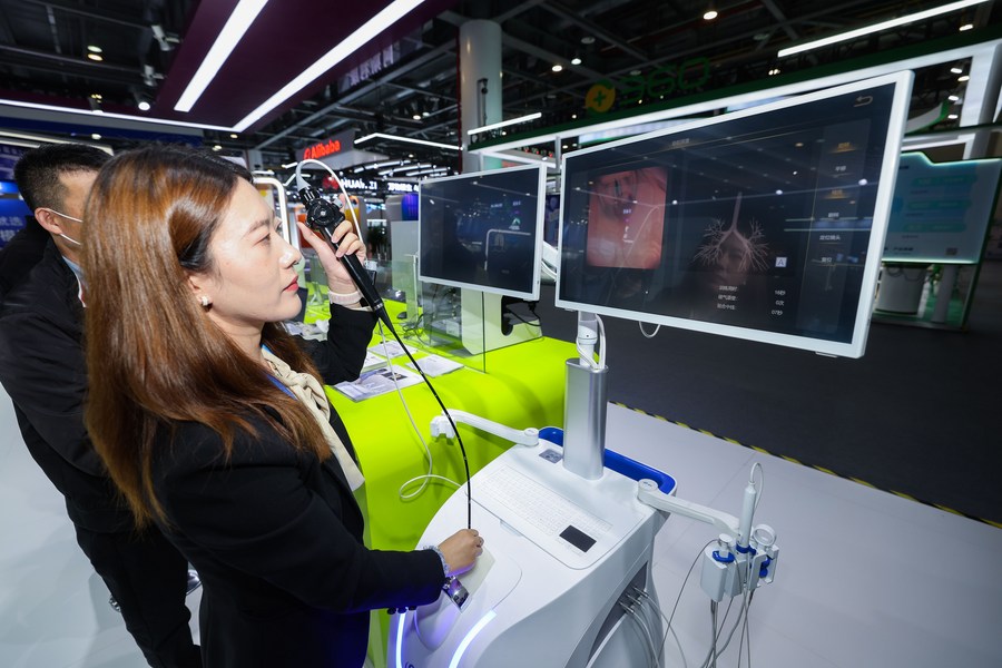 This photo taken on Nov. 23, 2023 shows a simulation system for medical practice at the second Global Digital Trade Expo in Hangzhou, east China's Zhejiang Province. (Xinhua/Xu Yu)
