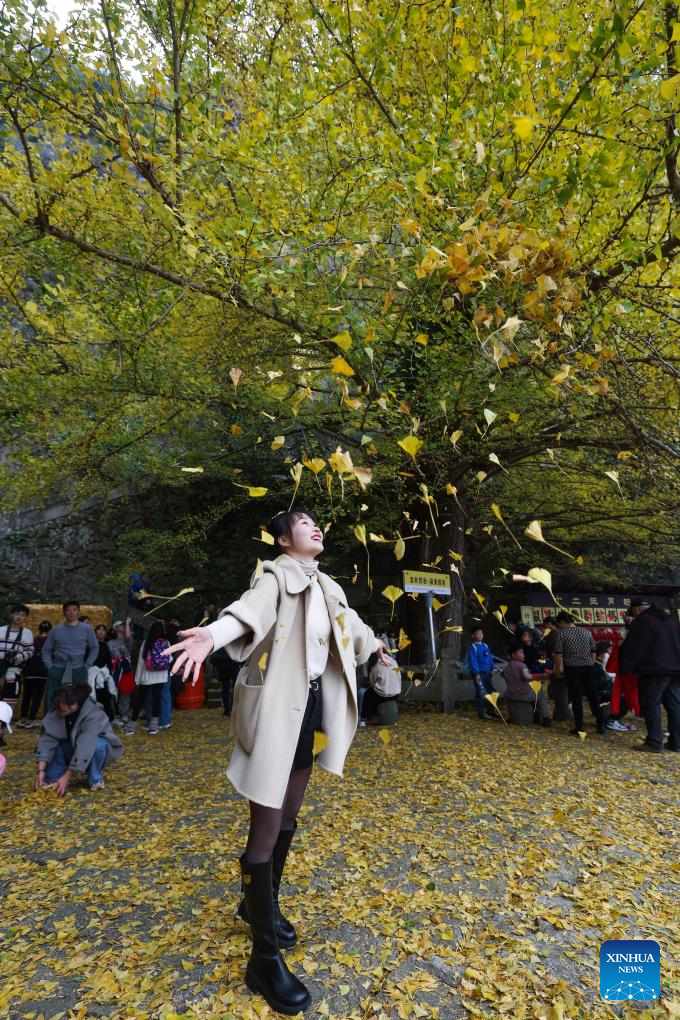 A visitor enjoys the scenery under an old ginkgo tree at Daciyan scenic site in Jiande City of east China's Zhejiang Province, Nov. 26, 2023. The over 700-year-old ginkgo tree has attracted visitors for its golden leaves. (Xinhua/Xu Yu)