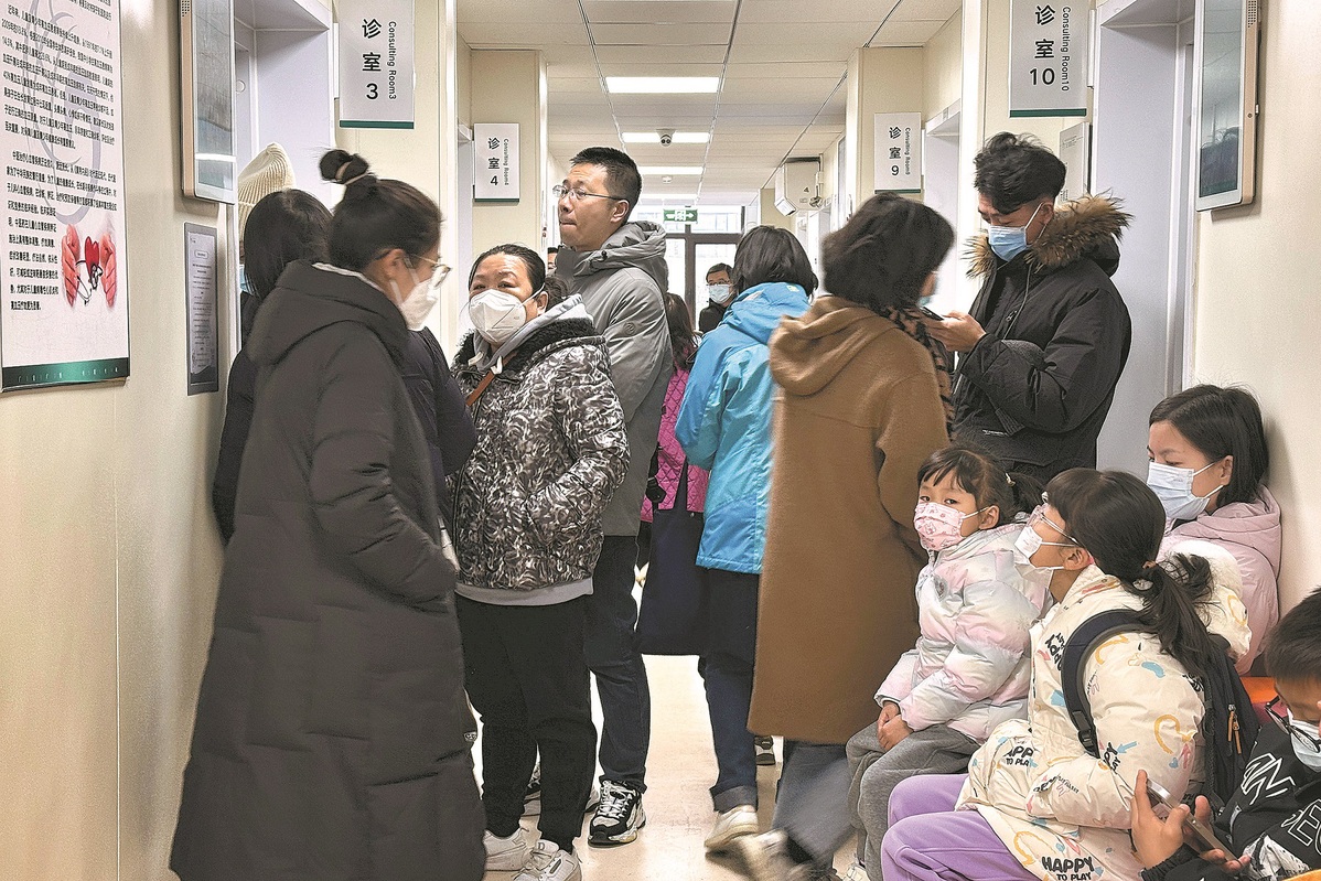 Children and parents wait in the pediatrics department at Guang'anmen Hospital in Beijing on Sunday. [Photo by Du Lianyi/China Daily]