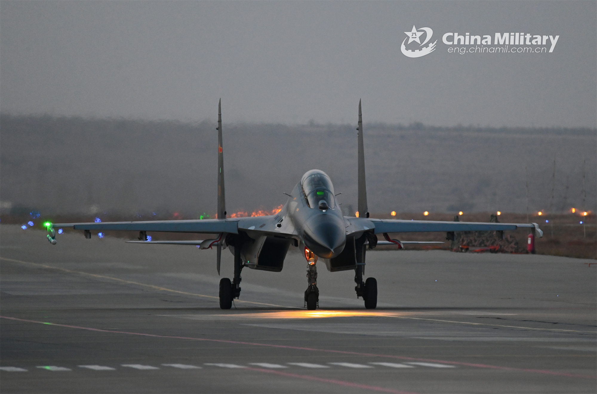 A fighter jet attached to an aviation brigade with the air force under the PLA Western Theater Command taxies on the runway during an around-the-clock flight training exercise on November 20, 2023. (eng.chinamil.com.cn/Photo by Yu Zeqi)
