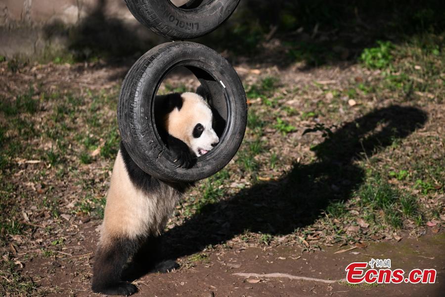 Giant panda cub Yu Ai plays in the sunshine at Chongqing Zoo, Nov. 27, 2023. (Photo: China News Service/He Penglei)