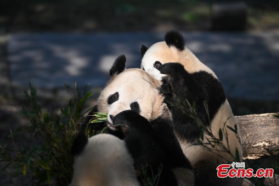 Giant pandas eat bamboo while enjoying the sunshine at Chongqing Zoo, Nov. 27, 2023. (Photo: China News Service/He Penglei)