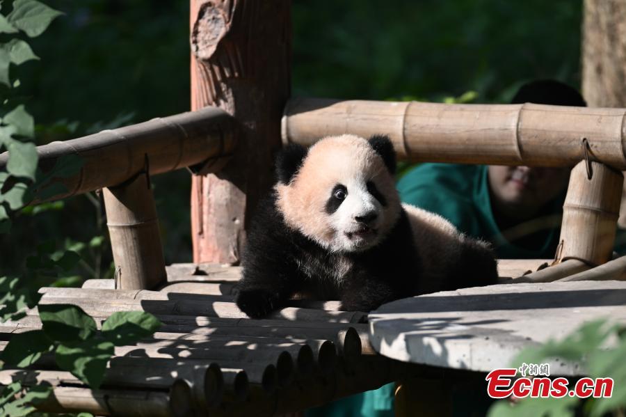 A giant panda cub enjoys the sunshine at Chongqing Zoo, Nov. 27, 2023. (Photo: China News Service/He Penglei)