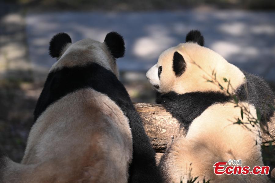 Giant pandas rest in the sunshine at Chongqing Zoo, Nov. 27, 2023. (Photo: China News Service/He Penglei)