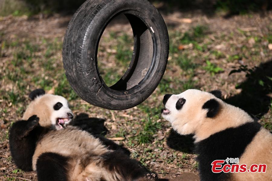 Giant panda pigeon cubs Yu Ke and Yu Ai play in the sunshine at Chongqing Zoo, Nov. 27, 2023. (Photo: China News Service/He Penglei)