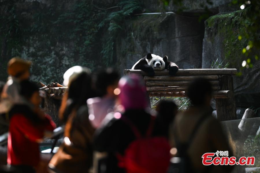 A giant panda sleeps at Chongqing Zoo, attracting many visitors, Nov. 27, 2023. (Photo: China News Service/He Penglei)
