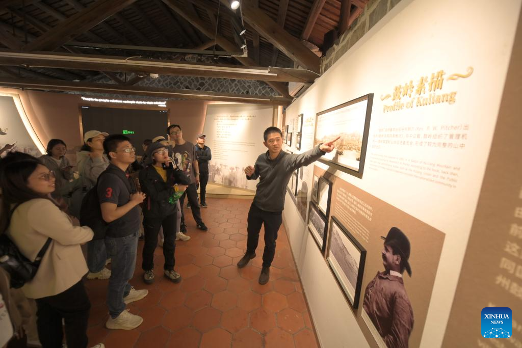Lin Yinan (1st, R) introduces the Kuliang stories to tourists in Fuzhou, southeast China's Fujian Province, Nov. 23, 2023. (Xinhua/Lin Shanchuan)