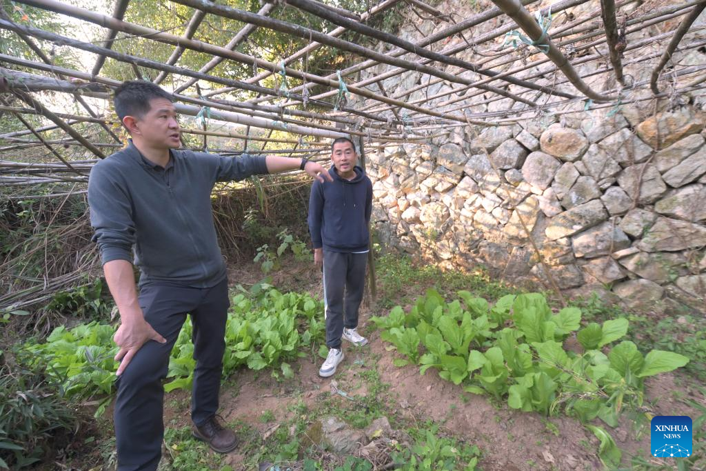 Lin Yinan (L) and a villager check the relic site of a villa once built by foreigners in Fuzhou, southeast China's Fujian Province, Nov. 23, 2023. (Xinhua/Lin Shanchuan)
