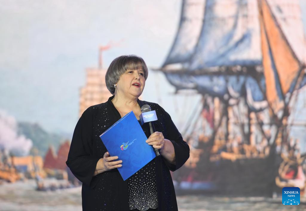 This file photo taken on Nov. 30, 2018 shows Elyn MacInnis telling her family's stories with Kuliang at a tourism festival in Fuzhou, southeast China's Fujian Province. (Xinhua/Lin Shanchuan)
