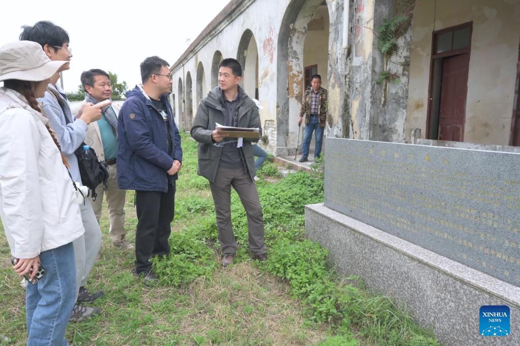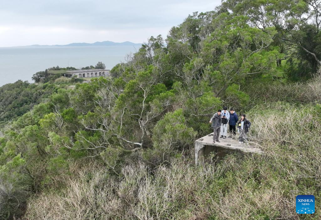 This aerial photo taken on Nov. 25, 2023 shows Lin Yinan (1st, L) and his team looking for relics once built by foreigners at an island in Fuzhou, southeast China's Fujian Province. (Xinhua/Lin Shanchuan)