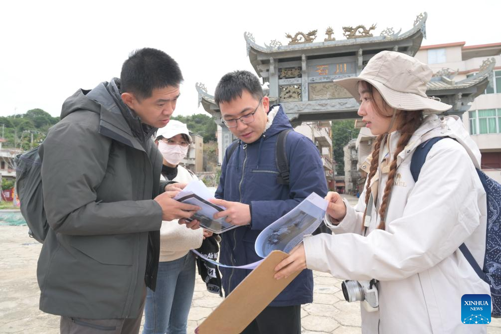 Lin Yinan (1st, L) and his team check aerial photos of relics once built by foreigners in Fuzhou, southeast China's Fujian Province, Nov. 25, 2023. (Xinhua/Lin Shanchuan)