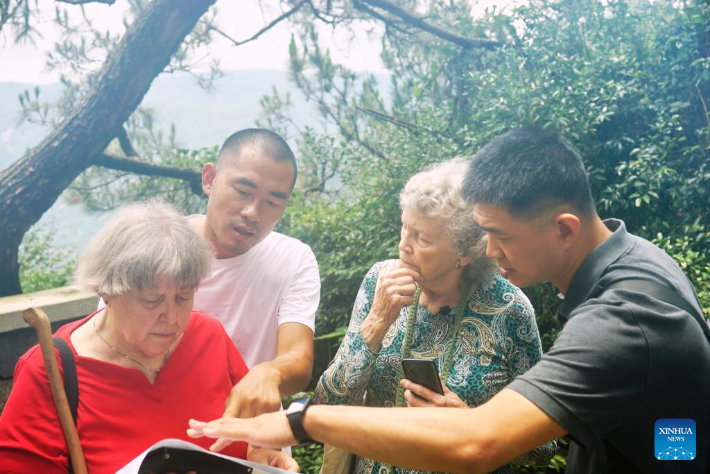 Lin Yinan (1st, R) and Elyn MacInnis (1st, L) check a map of Kuliang in Fuzhou, southeast China's Fujian Province, June 24, 2023. (Xinhua)