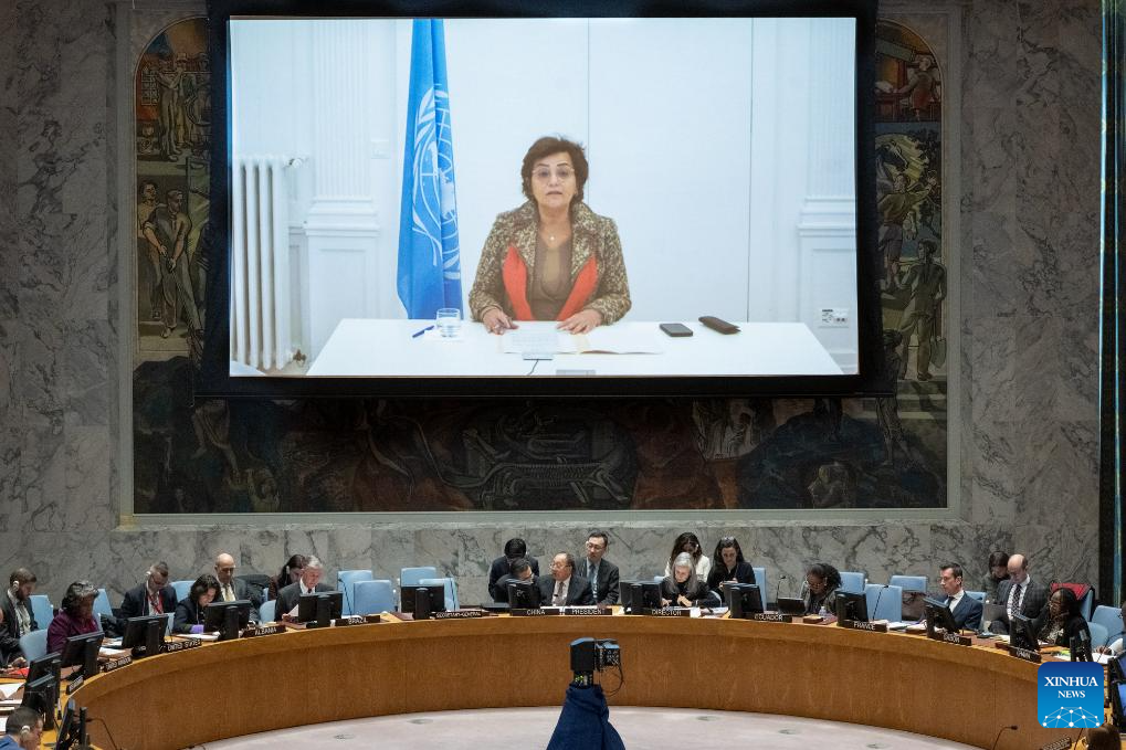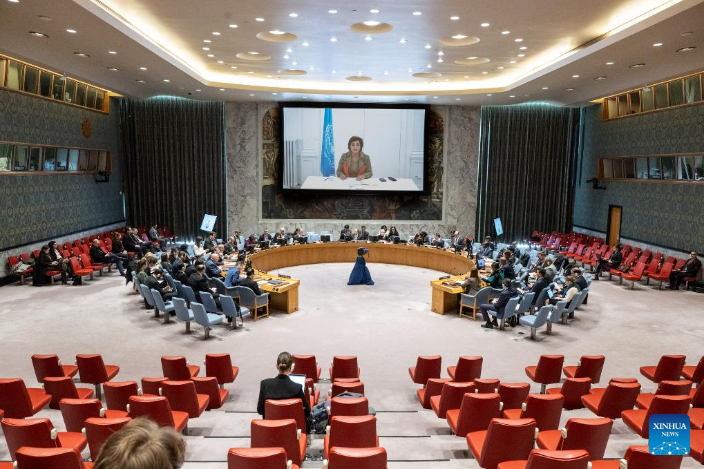 UN Deputy Special Envoy for Syria Najat Rochdi (on the screen) speaks at a Security Council meeting at the UN headquarters in New York, on Nov. 28, 2023. Rochdi on Tuesday called for urgent de-escalation in Syria and warned of the spillover of the Israeli-Palestinian conflict. (Eskinder Debebe/UN Photo/Handout via Xinhua)