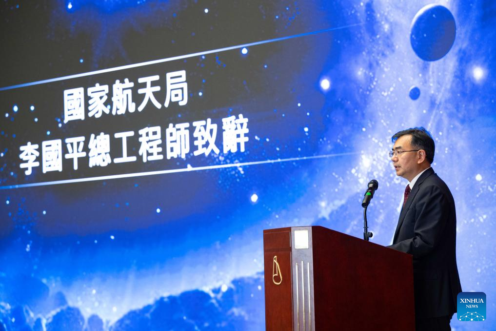 Li Guoping, chief engineer of the China National Space Administration (CNSA), delivers a speech at the ceremony in south China's Macao, Nov. 28, 2023. An exhibition of China's achievements on space exploration and navigation opened on Tuesday in the Macao Special Administrative Region (SAR), in the interests of inspiring Macao's technological innovations. (Xinhua/Cheong Kam Ka)