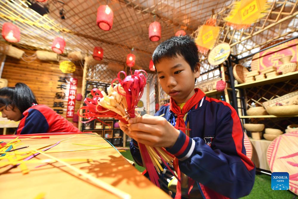 A student practices the bamboo weaving skill at Nandu primary school in Cenxi City, south China's Guangxi Zhuang Autonomous Region, Nov. 28, 2023. As a local intangible cultural heritage, the bamboo weaving skill was introduced to Nandu primary school in recent years, which enriched the extracurricular activities of the students. (Xinhua/Huang Xiaobang)
